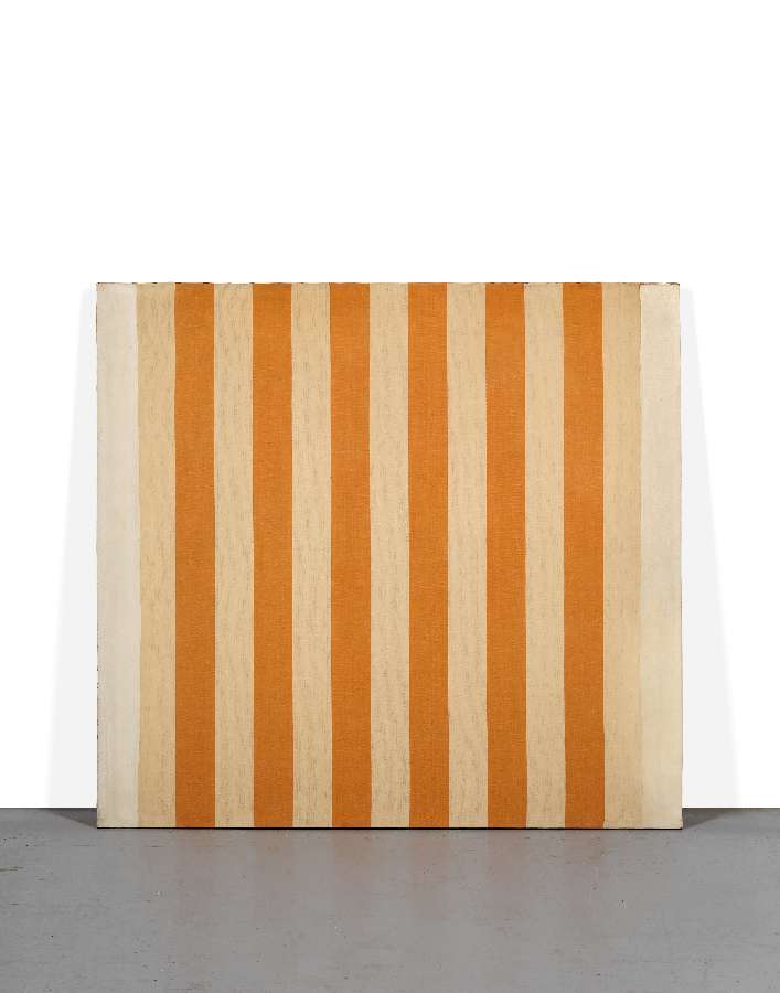 Peinture acrylique blanche sur toile de coton à rayures blanches et orange, alternées et verticales, de 8,7 cm (± 0,3) de large chacune.